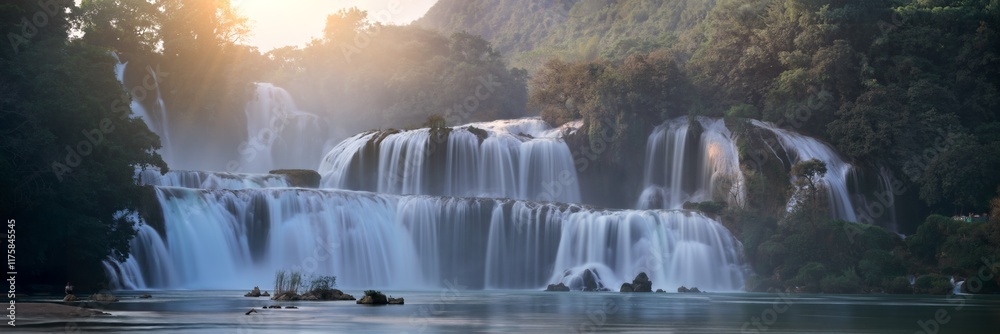 Panoramic View of Ban Gioc Waterfalls at Sunset, Vietnam – Majestic Cascades in Lush Forest Setting, Ideal for Nature and Travel Themes.Unesco site.
