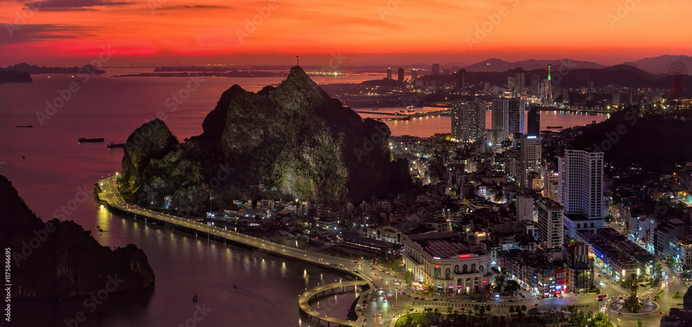 Sunset Over Ha Long Bay City, Vietnam – Illuminated Skyline and Coastal Promenade, Ideal for Travel and Urban Landscape Themes