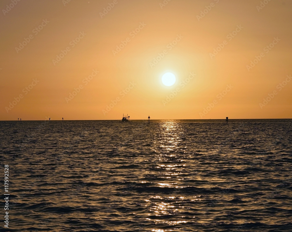 A boat coming in during a golden sunset at Hudson beach in Hudson, Florida.
