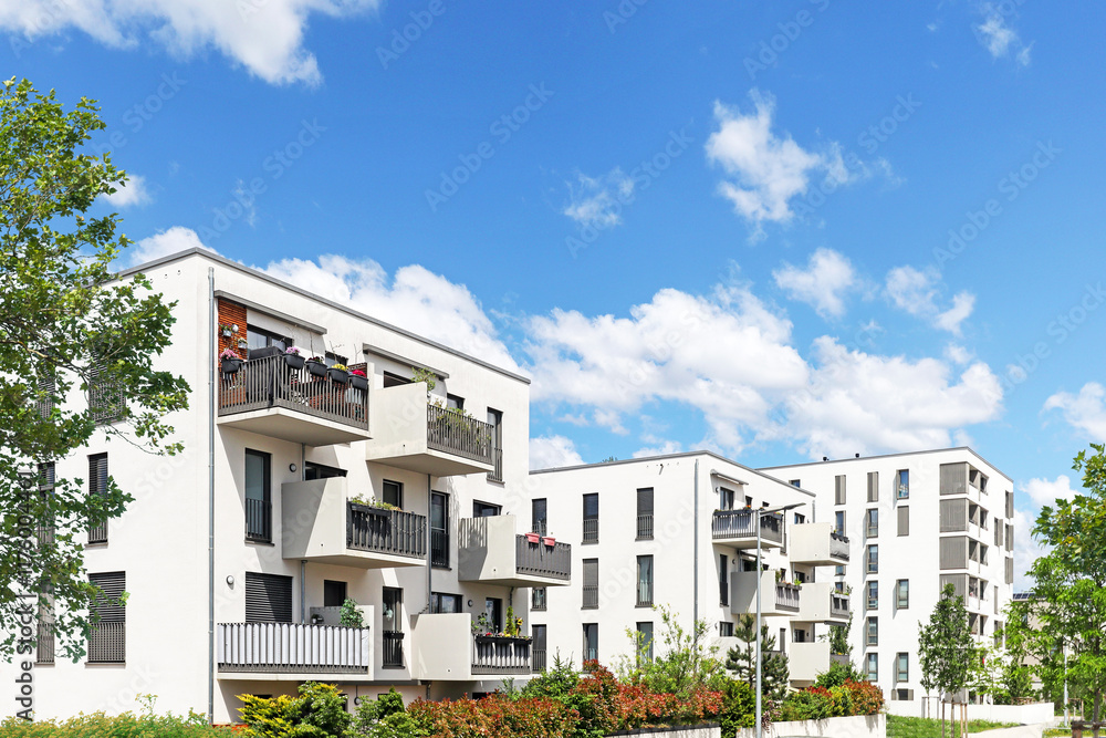 Cityscape of a residential area with modern sustainable apartment buildings, new green urban landscape in the city
