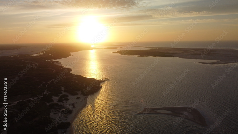 Vue aérienne panoramique paradisiaque de dunes de sable dans le désert avec lacs eau turquoise, Parc Lençois Maranhenses, Brésil