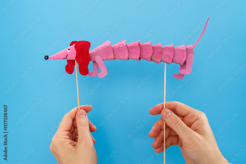 Handmade pink dachshund puppet held by hands against a blue background. toy crafted from recycled materials as empty carton egg box. Creativity and craft concept. DIY, art project for kids