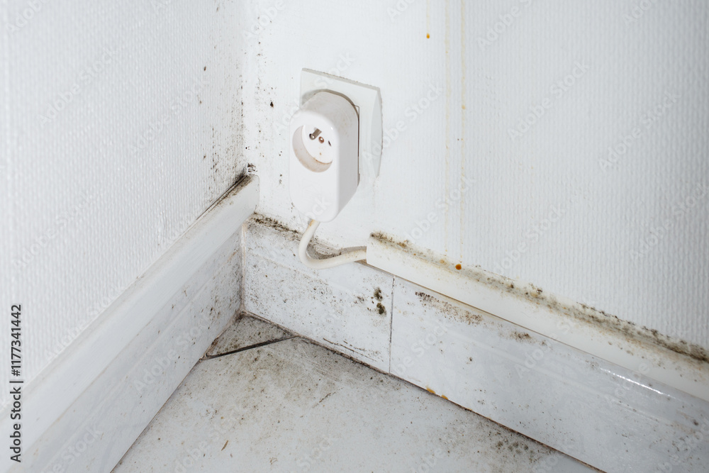 Mold growing on a white wall near a power socket with tiled floor. Indoor environmental issue and maintenance concept. Close-up photography for awareness and educational materials