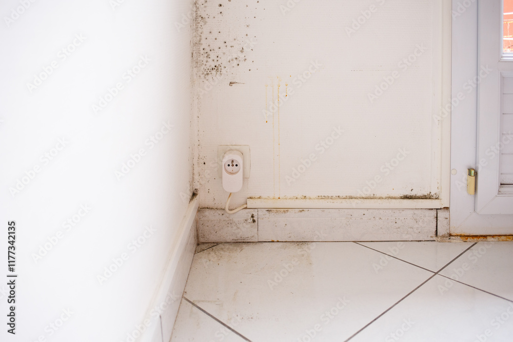 Mold infestation on a white wall near an electrical outlet with tiled flooring. Indoor maintenance and health hazard concept. Wide-angle view for educational and informational use
