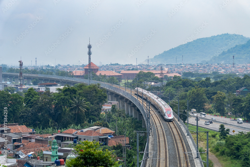 Jakarta Bandung High Speed Train railway turning on a bridge beside Purbaleunyi highway toll road, with Cimahi city skyline as background