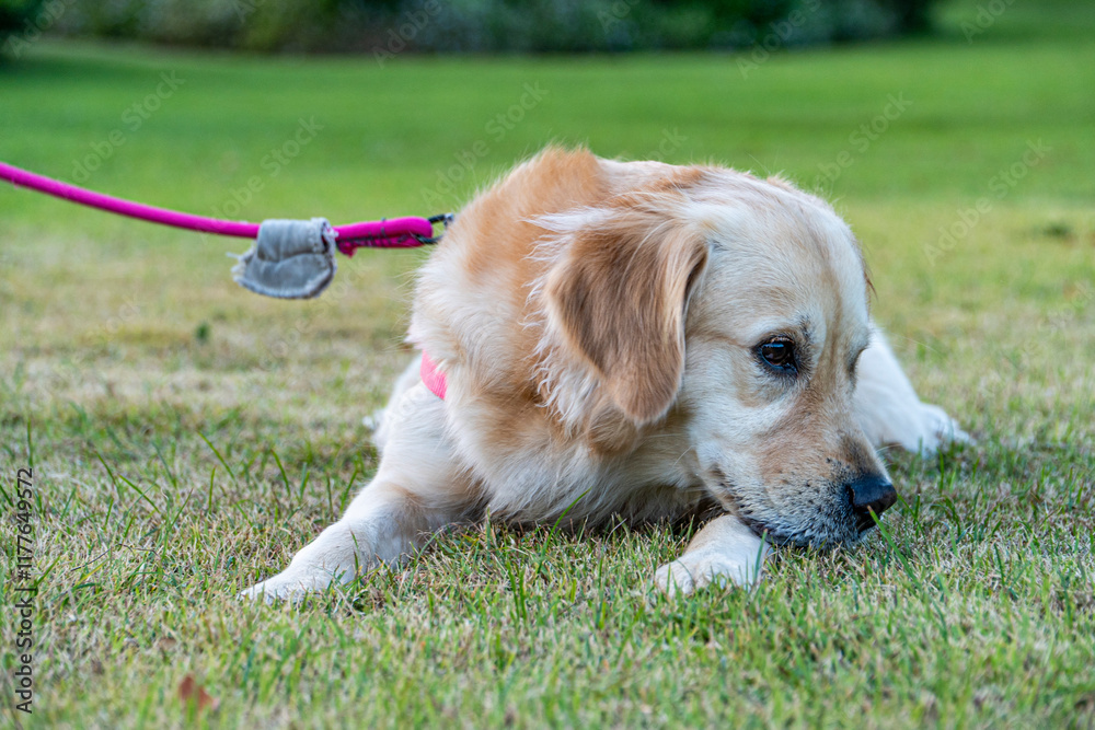 Puppy,Golden Retriever laying down, Happy Golden Retriever in public park.