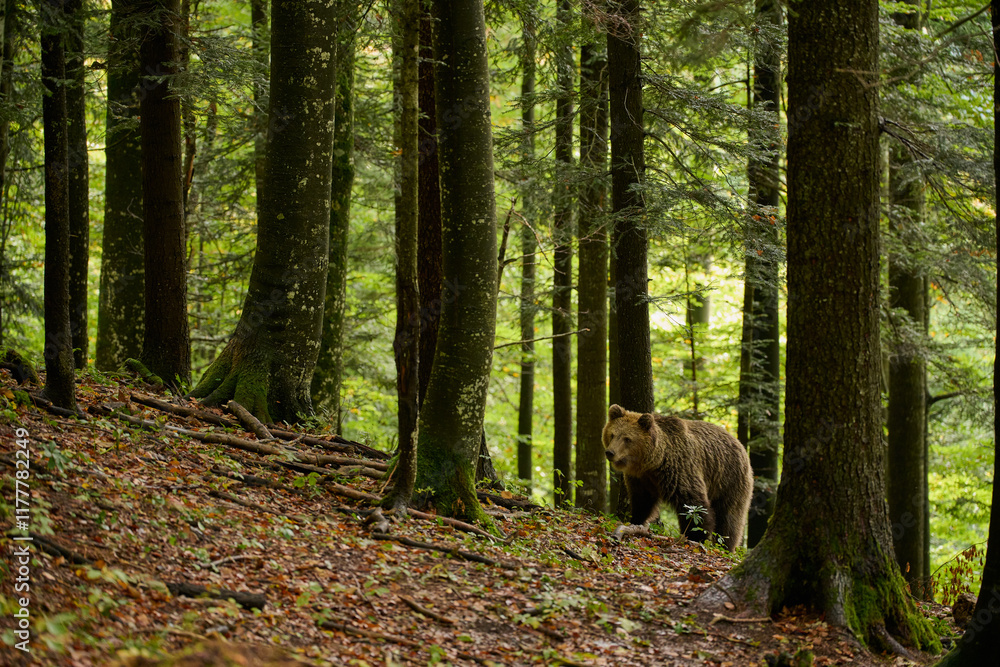 Brown bear is looking for food in a european forest. Image taken in autumn.