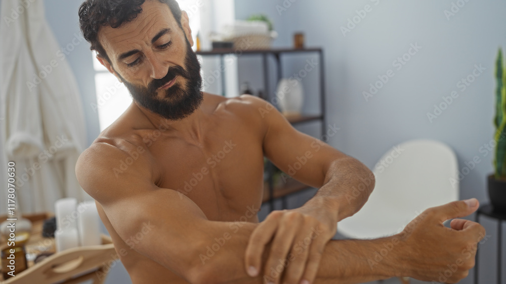 Handsome man with a beard in a wellness spa center applying lotion to his arm during a skincare routine