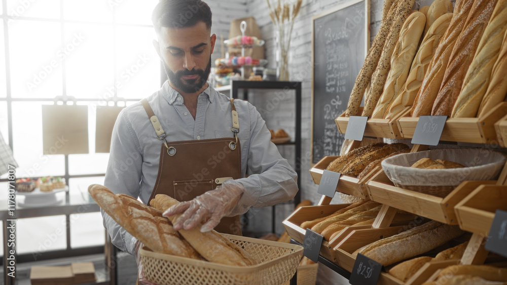 Young man with beard and apron arranging bread in basket in cozy bakery interior
