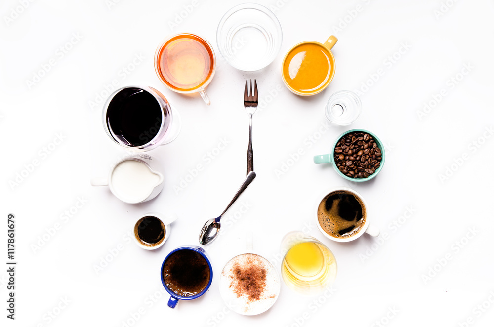 Cups with liquids like a coffee, milk, wine, alcohol, juice stacked in a circle. Clock consist of twelve cups. Time. Alarm clock. Beverages.