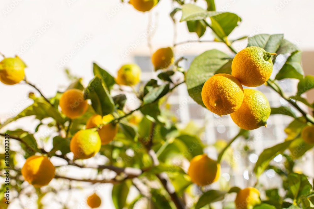 Bright yellow lemons hanging on a tree branch with green leaves, illuminated by warm sunlight on a clear day