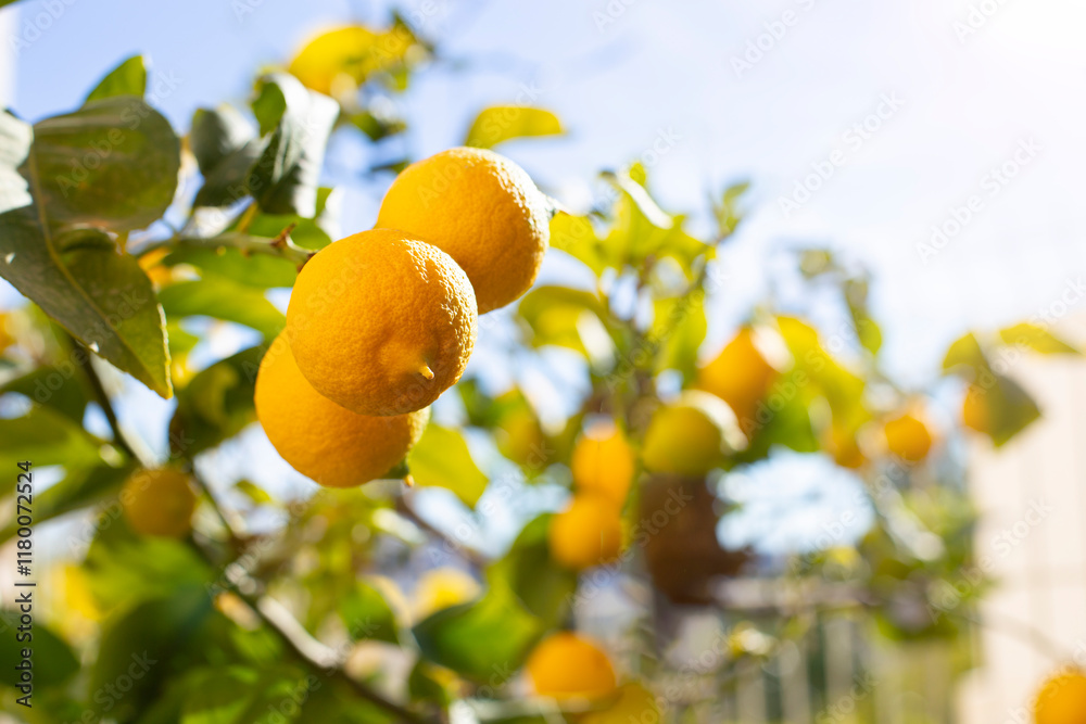 Fresh yellow lemons hanging on a vibrant green tree with sunlight streaming through the leaves