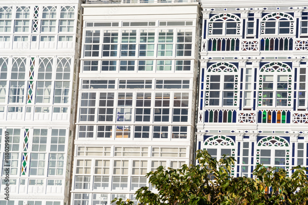 Typical buildings with characteristic windows on the seafront of the city of La Coruña, La Coruña, (Corunna), Galicia, spain