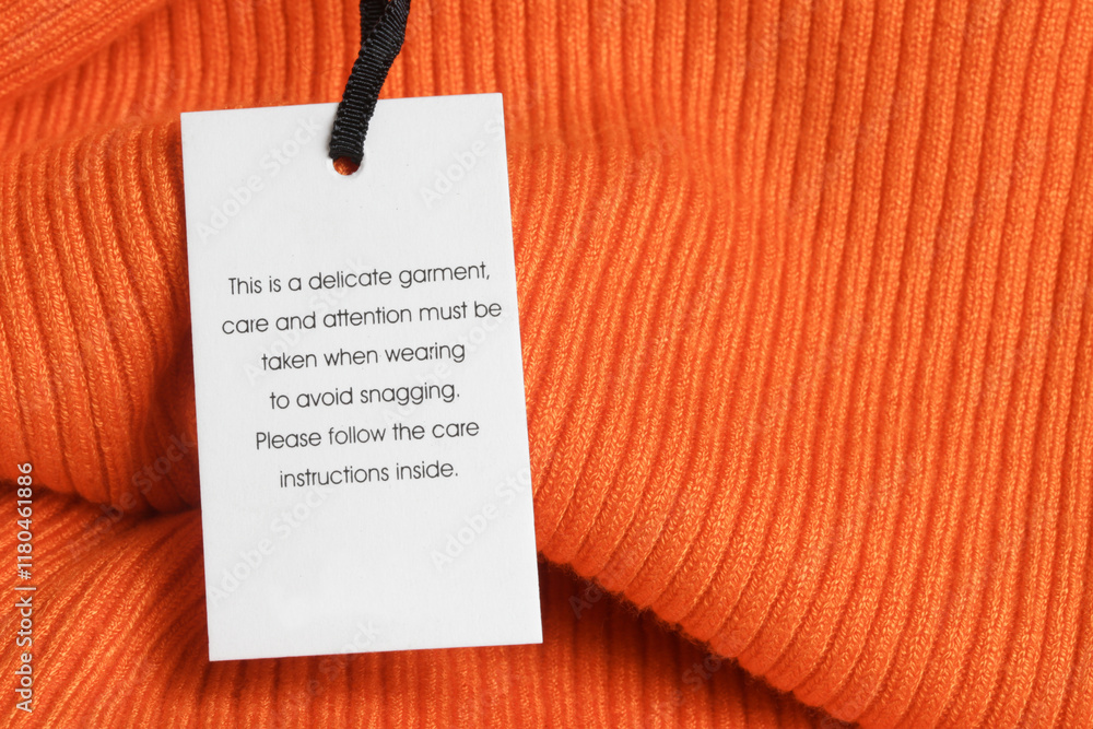 Close up of luxury clothing hang tag. Delicate garment swing tag. Laundry care washing instructions clothes label.