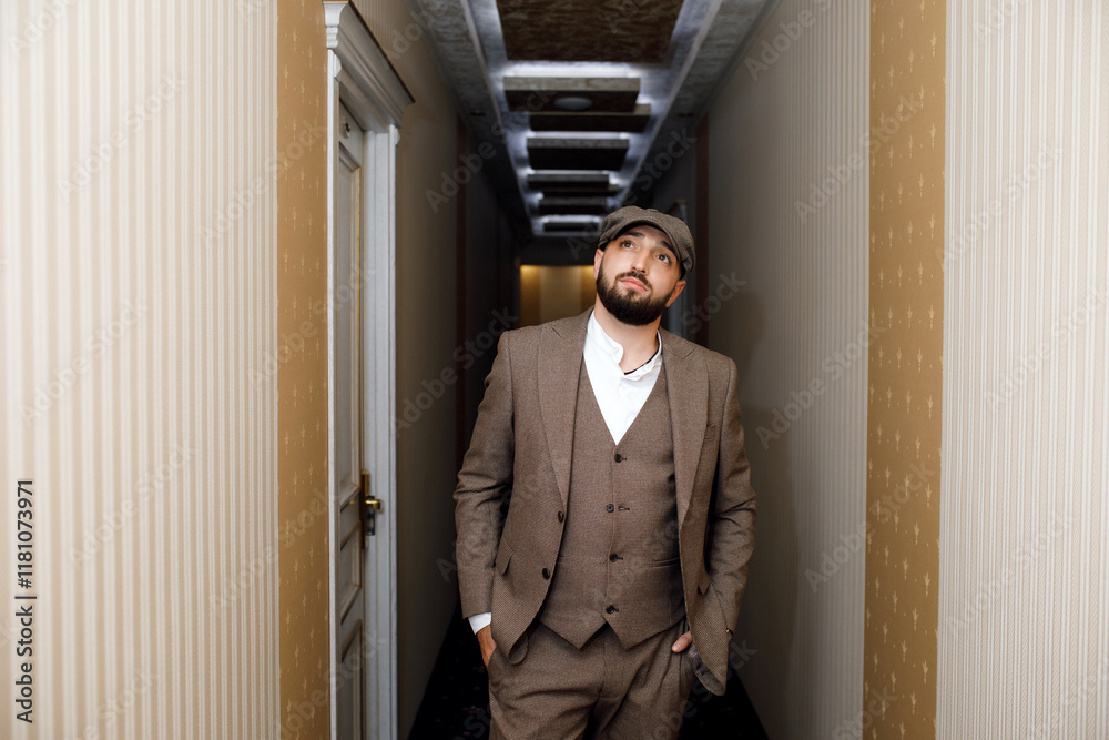 The man stands with his hands in his trouser pockets and looks at the camera. On his feet are white sneakers. The hallway has light walls with vertical stripes and a dark patterned carpet floor.