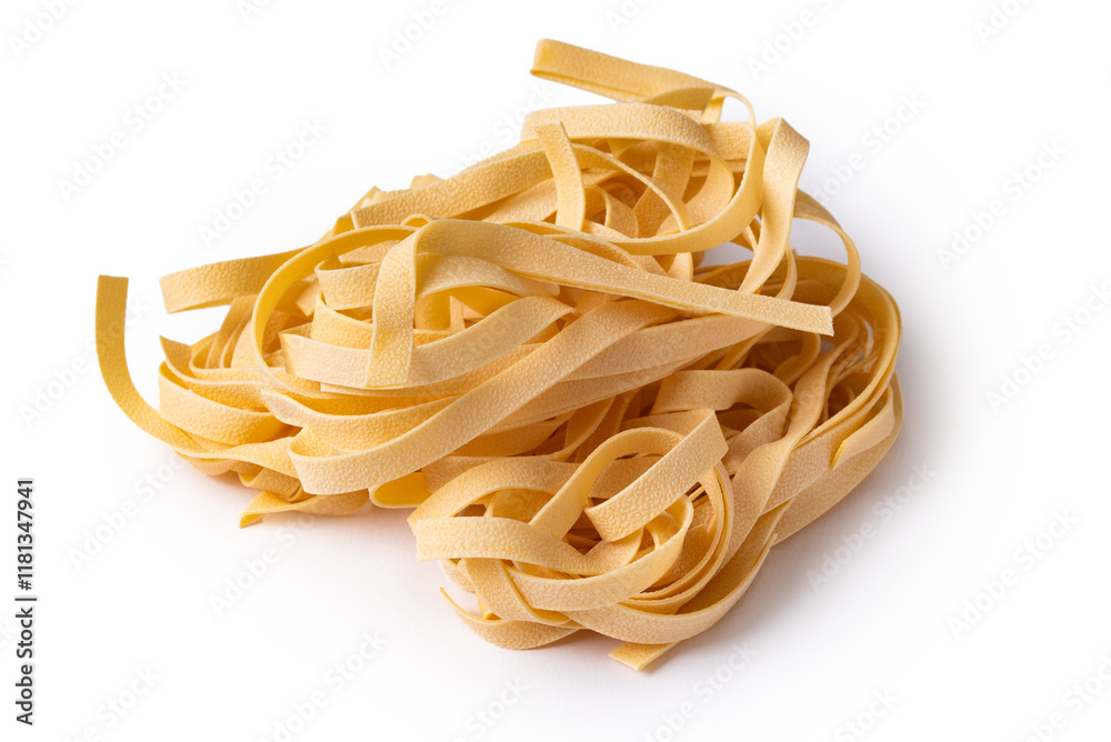 Fettuccine isolate su fondo bianco, tradizionale pasta all'uovo italiana, cibo europeo