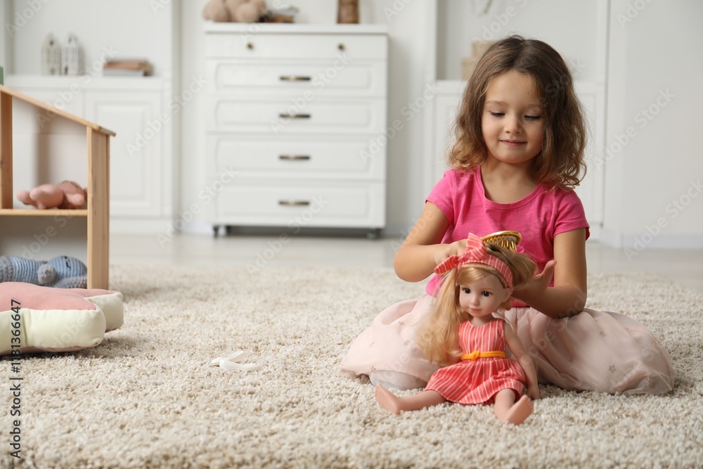 Cute little girl playing with her doll on floor at home. Space for text