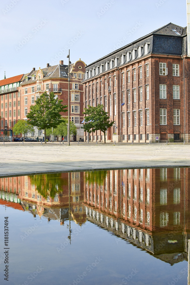 Beautiful old red brick building reflected in water. Danish style brick building in Copenhagen.