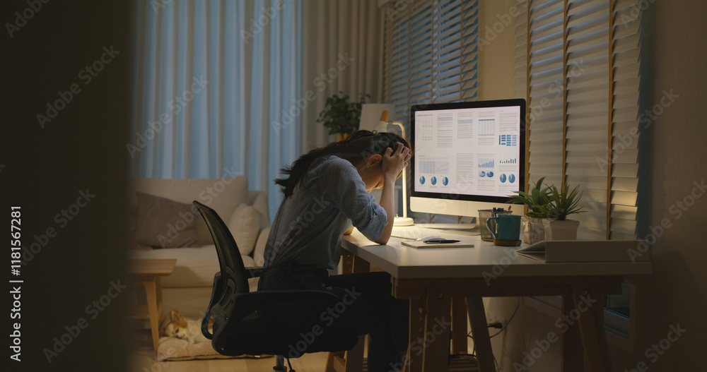 Asia people young woman study hard overnight brownout bored remote learn online read data tired sitting head in hands at home office desk workplace think worry in job tough stress workforce issue.