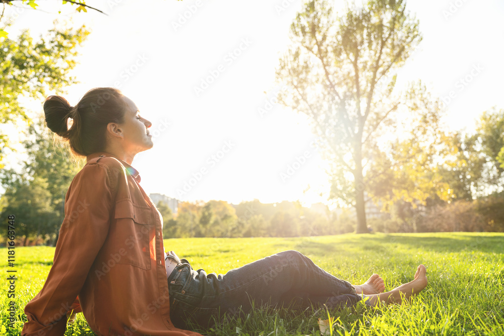 Urban woman sitting on the green grass in city park relaxing after work. Work and life balance, mental health and recovery.