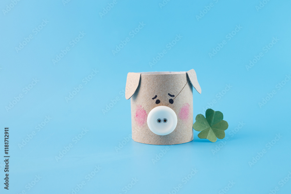 Cardboard tube pig craft with a button nose and a green paper clover on a blue background. St. Patrick Day and children DIY project concept. composition with copy space