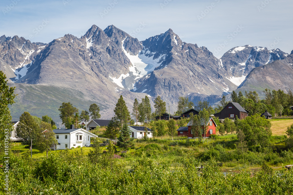 Scandinavian landscape with rapids in a river and a glacier in the background on the island Lyngen in Norway