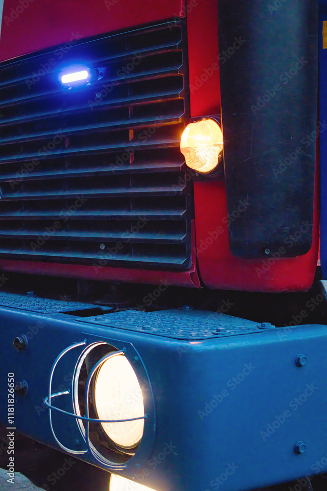 Bright lights illuminate the front of a vintage truck parked in an urban setting during twilight hours