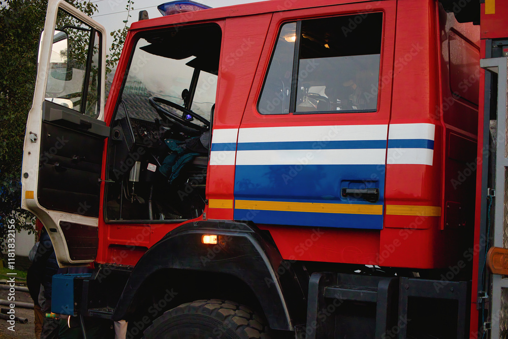 Bright red fire truck parked under cloudy skies with open door revealing the interior controls and equipment