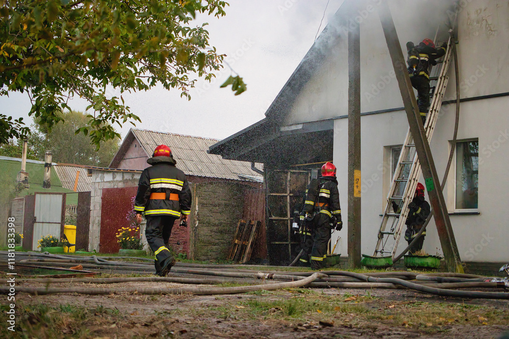 Courageous firefighters battle smoke and flames in a rural setting amid an urgent rescue operation