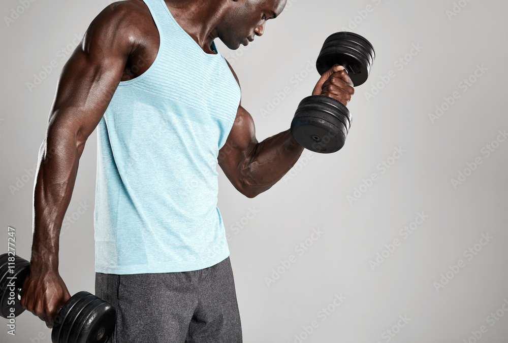 Young man exercising with hand weights