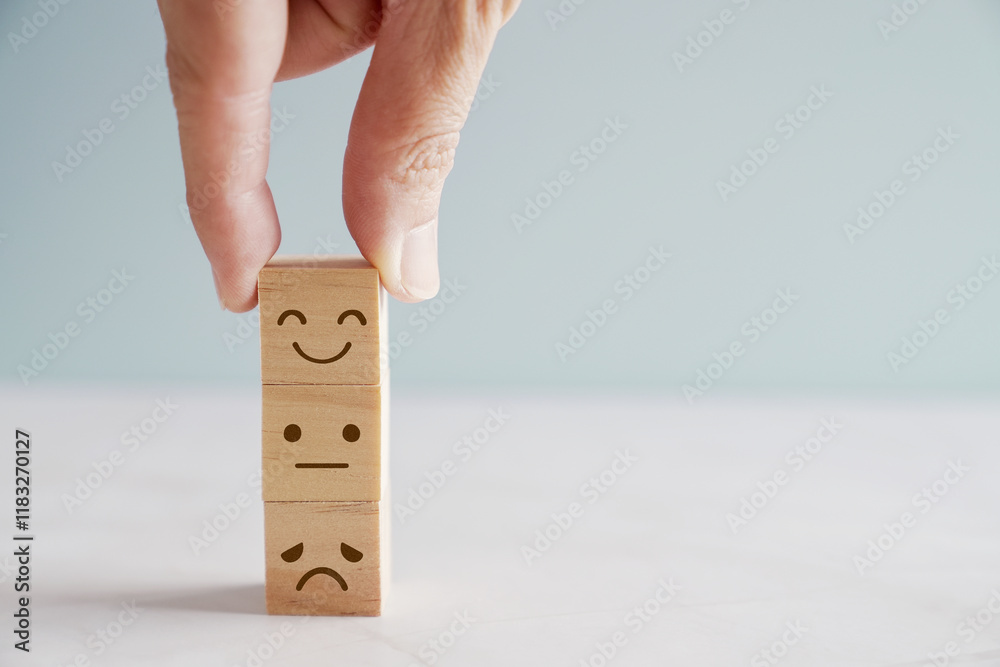 Hand choosing happy smile face wooden block, good feedback rating and positive customer review, mental health assessment, child wellness,world mental health day, think positive, compliment day concept