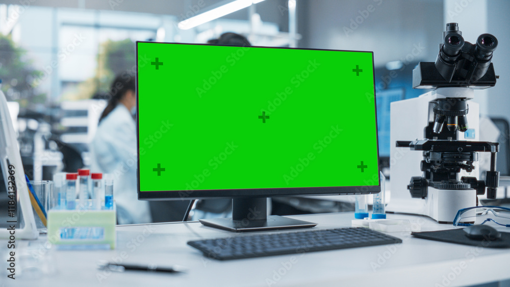 Desktop Computer with Green Screen Mock Up Display Standing on a Table in a Science Laboratory Next to a Microscope and Test Tubes with Biological Samples. Anonymous People Working in the Background