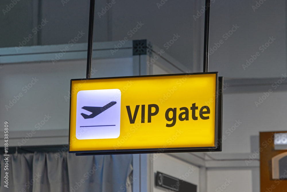 Illuminated Vip Gate Yellow Sign Hanging from Ceiling at Airport