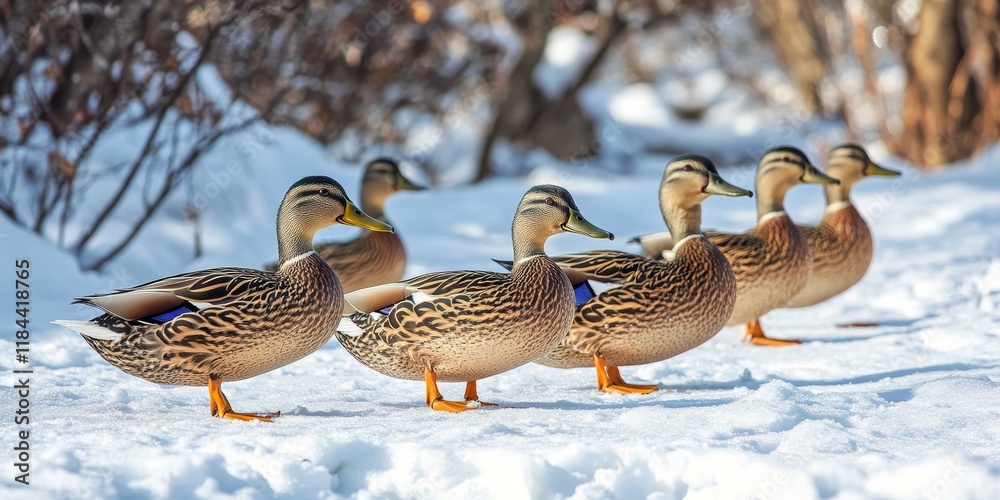 Wild ducks foraging on snow during winter, showcasing Anas platyrhynchos in their natural habitat. Experience the charm of wild ducks as they navigate through snowy landscapes.