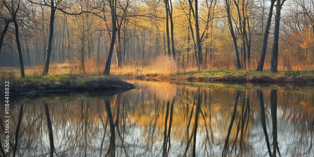 Reflections of trees in water create a serene scene in an early spring landscape, showcasing the beauty of nature s transformations as the trees awaken in this picturesque setting.