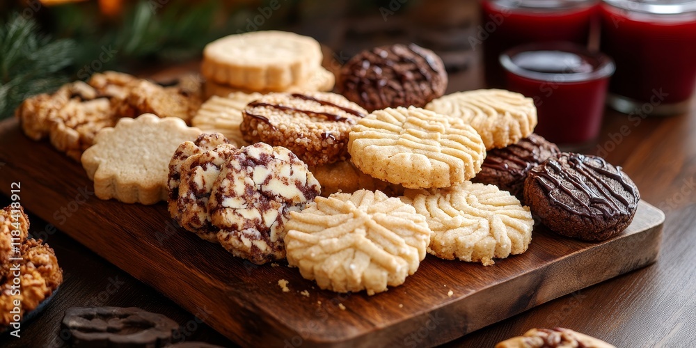 An assortment of artisanal Scottish shortbread cookies and rice pudding cookies is beautifully displayed on a wooden board, drawing attention as the main highlight.