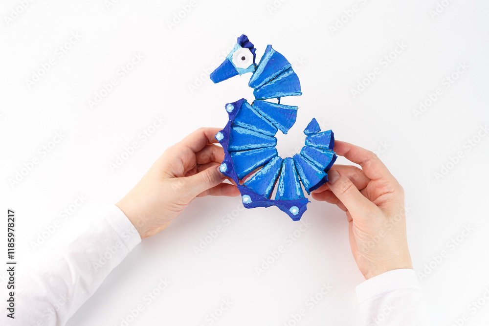 Blue seahorse-shaped craft painting from egg carton. Close-up DIY project on white background. Art and creativity concept for craft tutorials and education resources