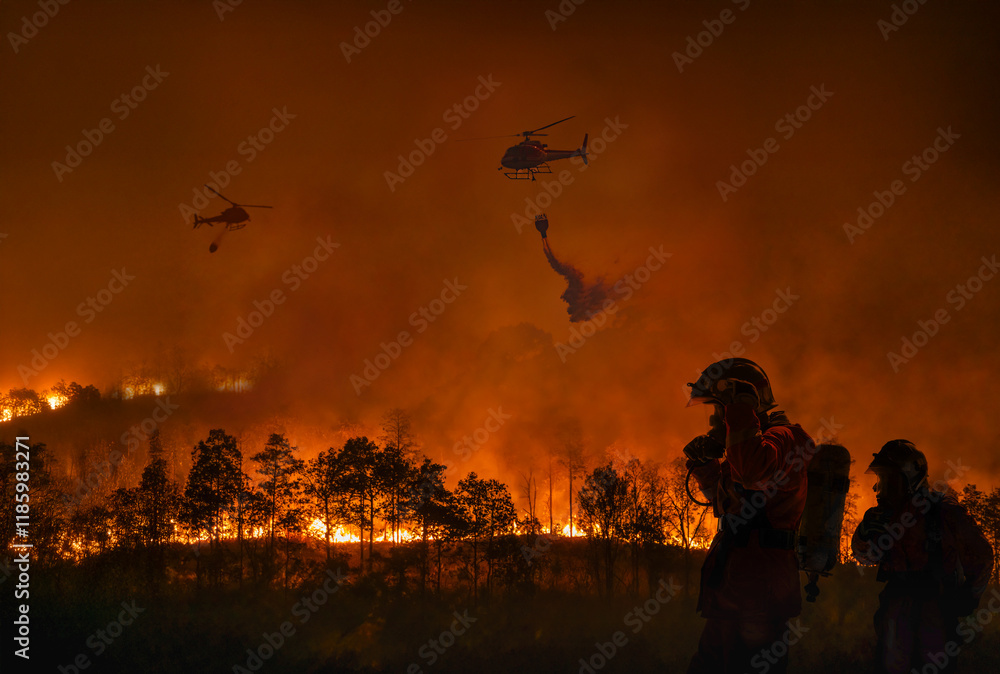 Fire fighting helicopter carry water bucket to extinguish the forest fire.