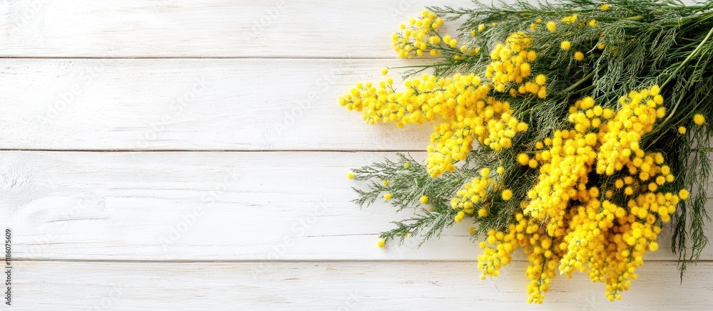 A beautiful bouquet of mimosa flowers on a white wooden table top view Copyspace available