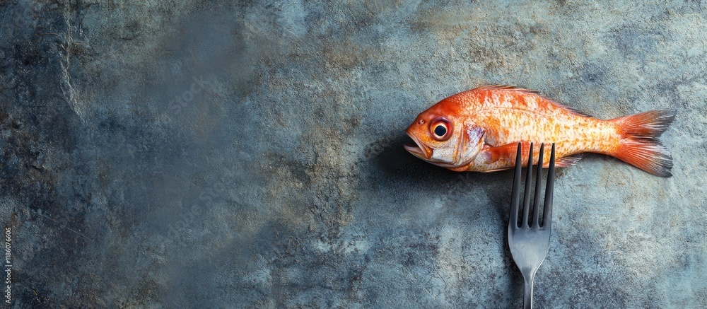 Raw fish with a fork on a stone surface. with copy space image. Place for adding text or design