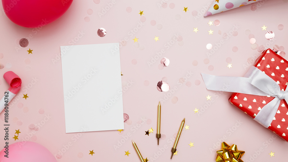 Concept of festive birthday celebrations. Blank card surrounded by colorful balloons, party hats, candles, confetti