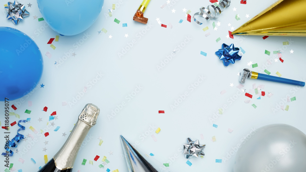 Concept of festive birthday celebrations. Birthday attributes colorful balloons, party hats, candles, confetti