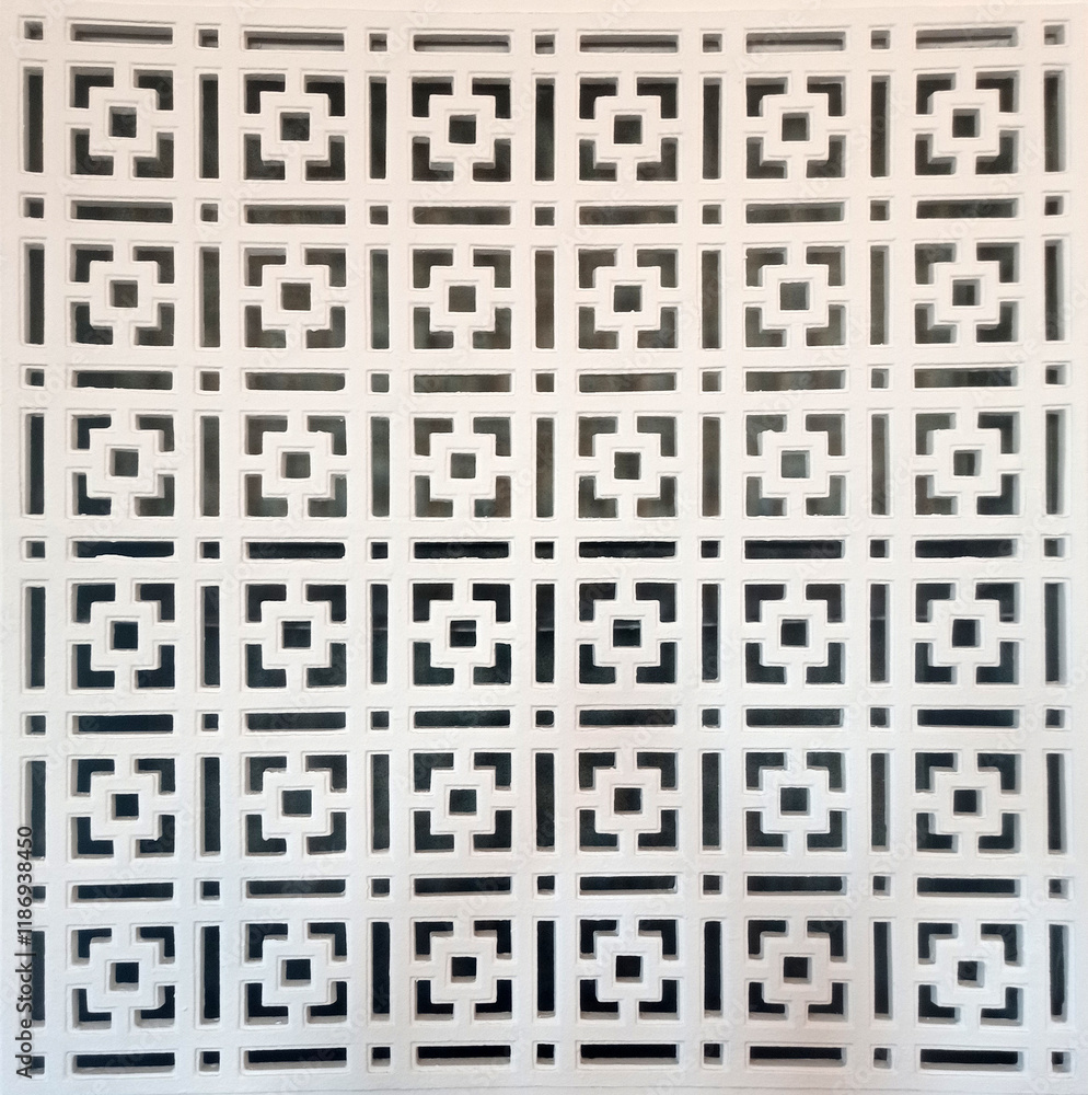 Gypsum geometric shapes in interior. Geometric design. Beautiful ornament background close-up. Seamless plaster ornament with geometric squares. Abstract background