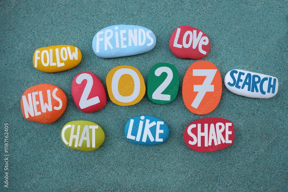 Happy 2027 full of joy, life, chat, followers, friends, love, search, news and share, creative multi colored hand painted stones over green sand