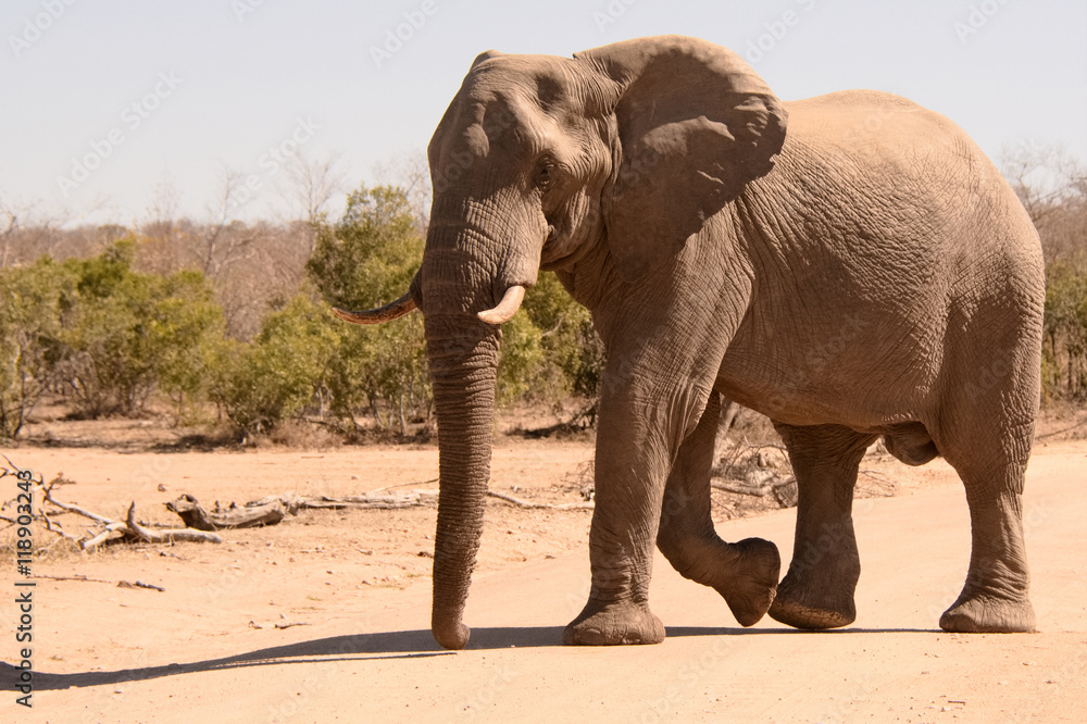 Lone African bull elephant strolling peacefully across the road to drink at the nearby waterhole