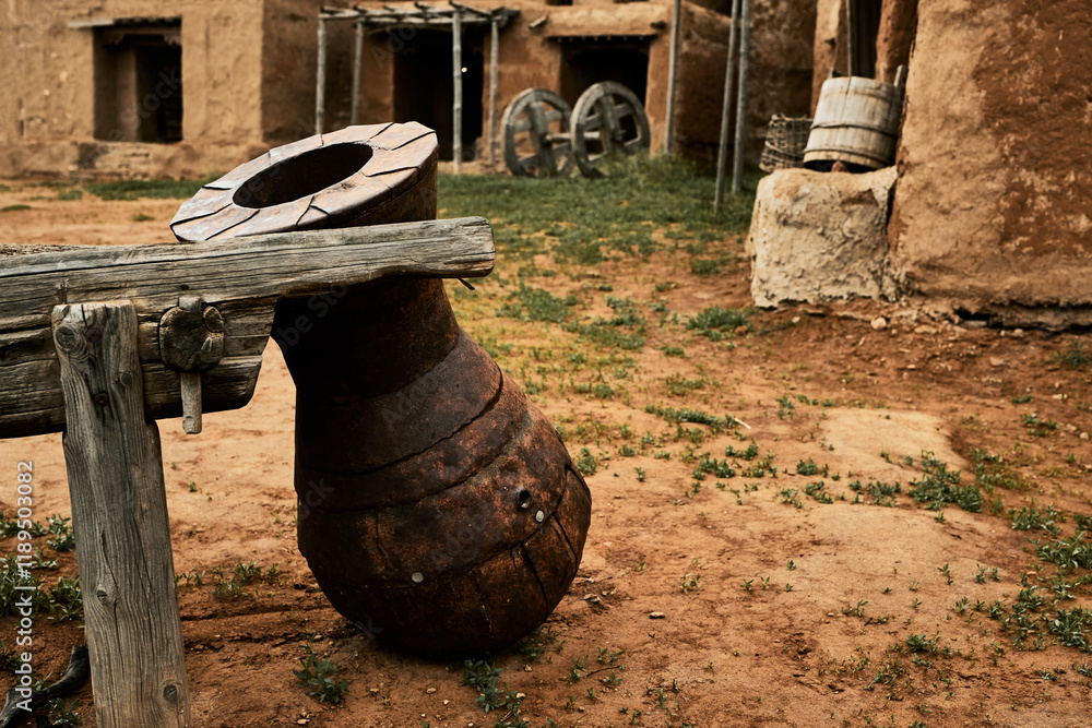 Antique jug against the background of an old town street. Sarai-Batu, Russia, Astrakhan region.