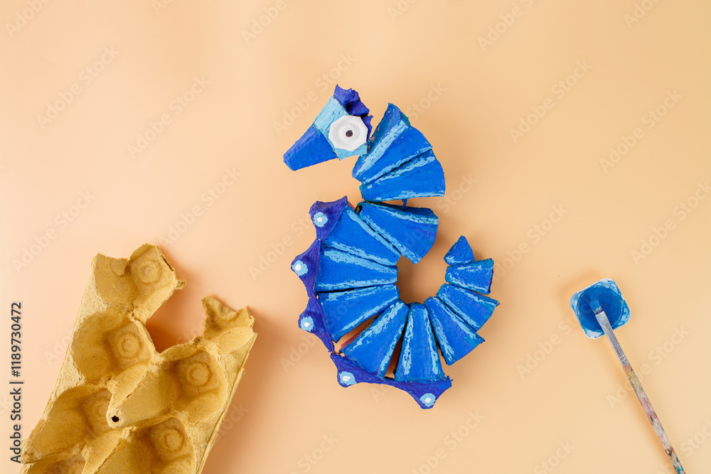 Painted blue egg carton seahorse with white eye on peach background. Craft project with paint and brush, showcasing recycling creativity and art for tutorials and workshops