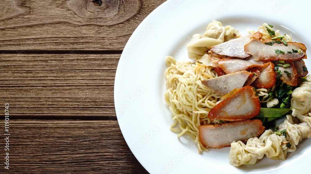 Egg noodles with red BBQ roast pork, dumpling, wontons and veget