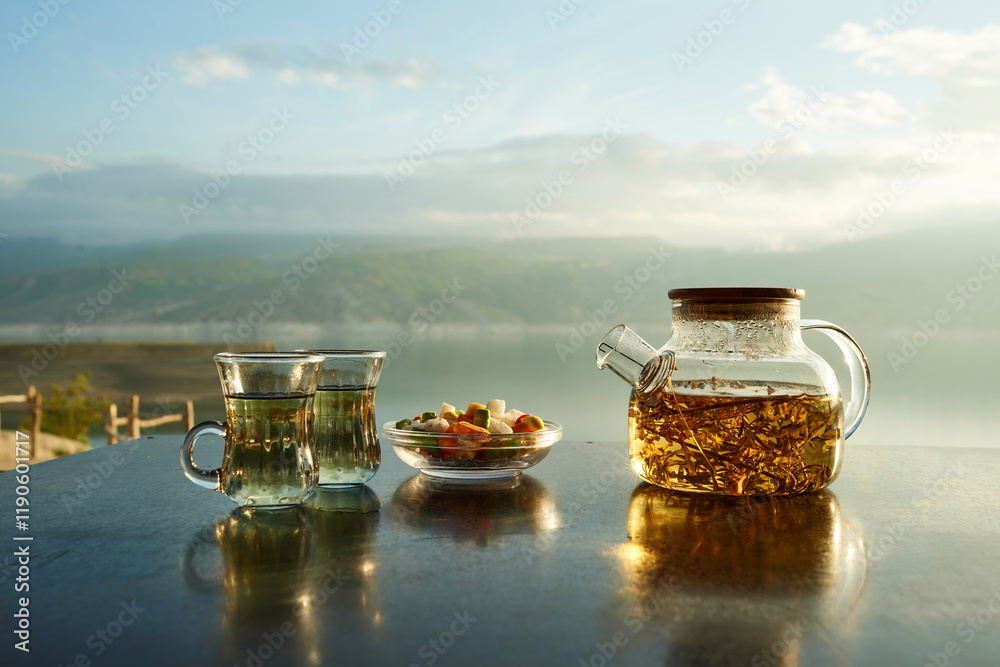 Glass teapot, cups and sugar against the backdrop of mountains and a lake at sunset. Outdoor recreation. Russia, Dagestan.