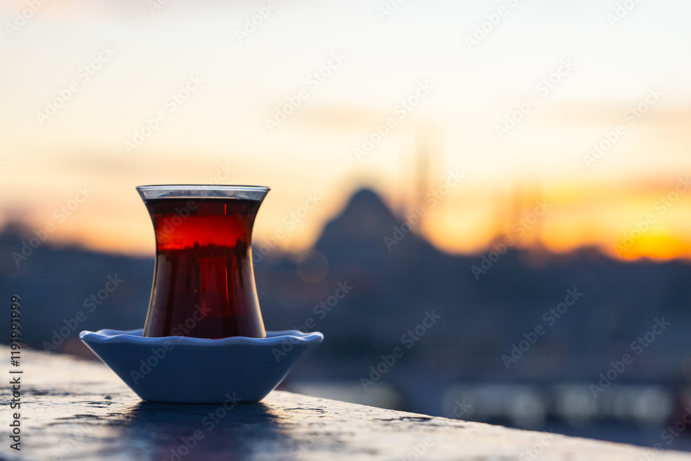 Turkish Tea (Türk Çayı) Photo in Front of Istanbul Symbol Suleymaniye Mosque, Galata Bridge Beyoglu, Istanbul Turkiye (Turkey)